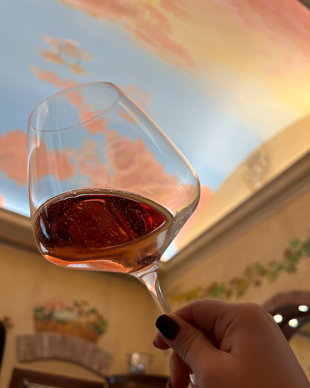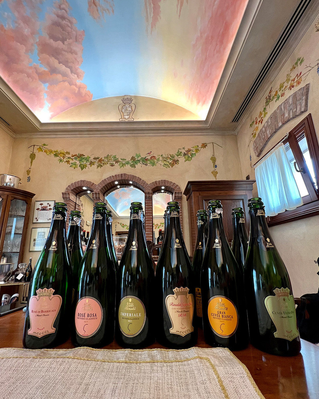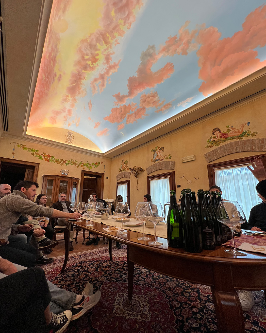 La degustazione si svolge all'interno di una sala con soffitti dipinti con nuvole dai colori pastello. In questo contesto osservare il colore e assaporare i vini Villa Rinaldi assume un fascino davvero speciale.